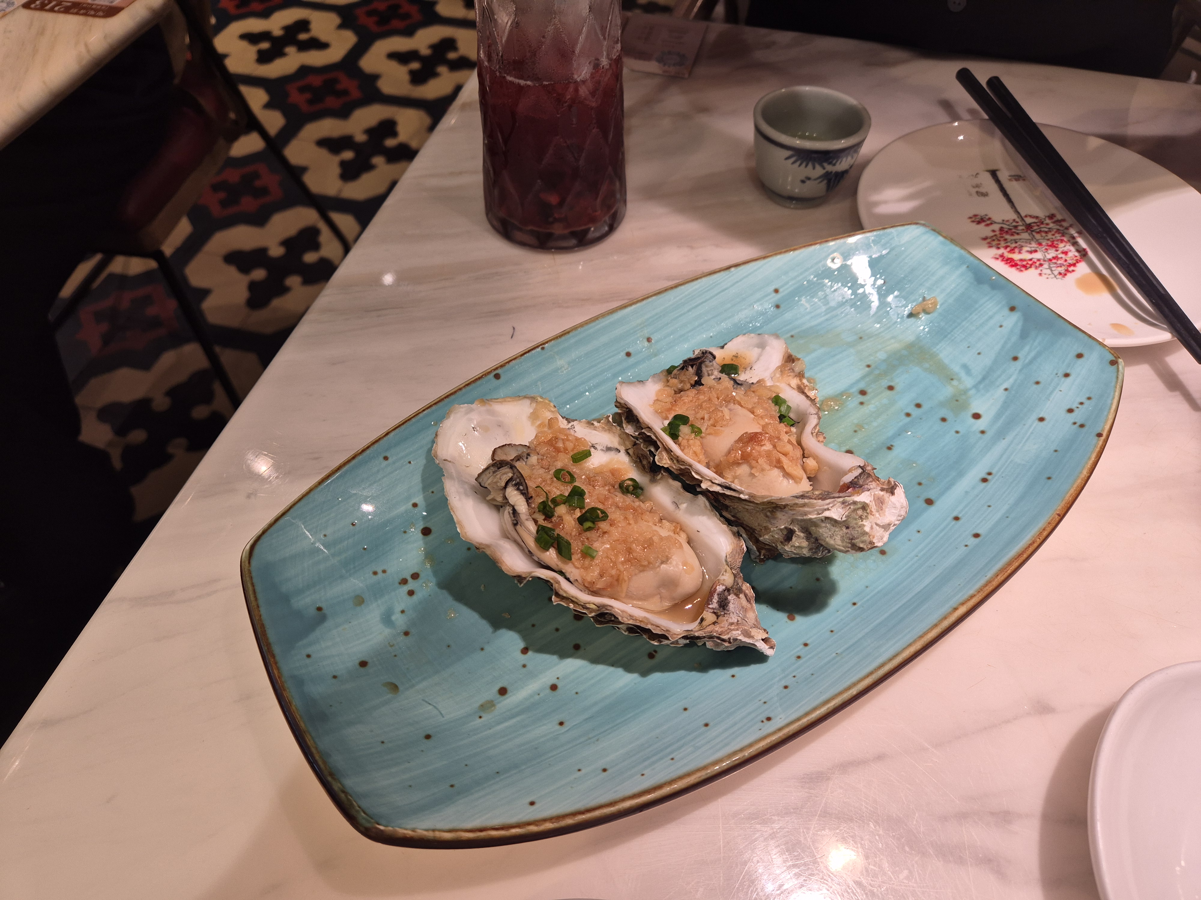밥 먹은 지 2시간도 채 안됐지만, 이번 여행은 진짜 '먹기 위해' 온 여행이므로 작은 요리를 맛보기 위해 열심히 주문을 했다. '红米肠粉, Hongmichangfen'이라 하는 겉쫀속바의 새우 딤섬과, 쫀득한 새우 딤섬인 '하가우'를 같이 시켰다. 그리고 굴 구이 요리도 시켜봤다.